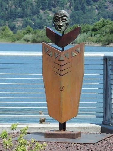 The bronze sculpture, on loan from local art collector David Radcliffe, pays tribute to Pitt’s Pacific Northwest Native American heritage. Her art honors the history and legends of her people. Those familiar with Pitt’s work may recognize, in the sculpture’s face, some design similarities to “She Who Watches,” a well-known ancient Columbia River petroglyph.