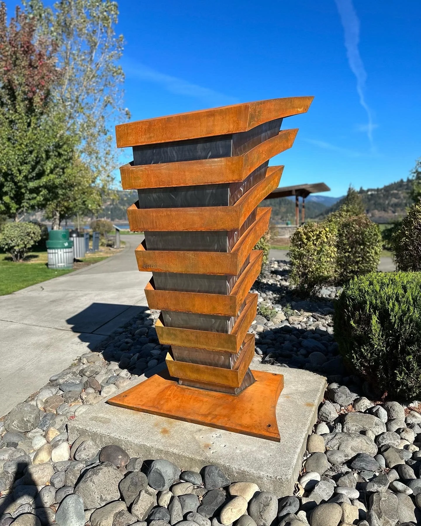 Benn Stover is an Oregon-based sculptor creating bold, abstract works that merge geometric structure with organic flow. Trained in industrial design and shaped by time in a fabrication shop, he transforms stainless steel and corten into sculptures that hold presence, invite reflection, and carry a lasting sense of energy.