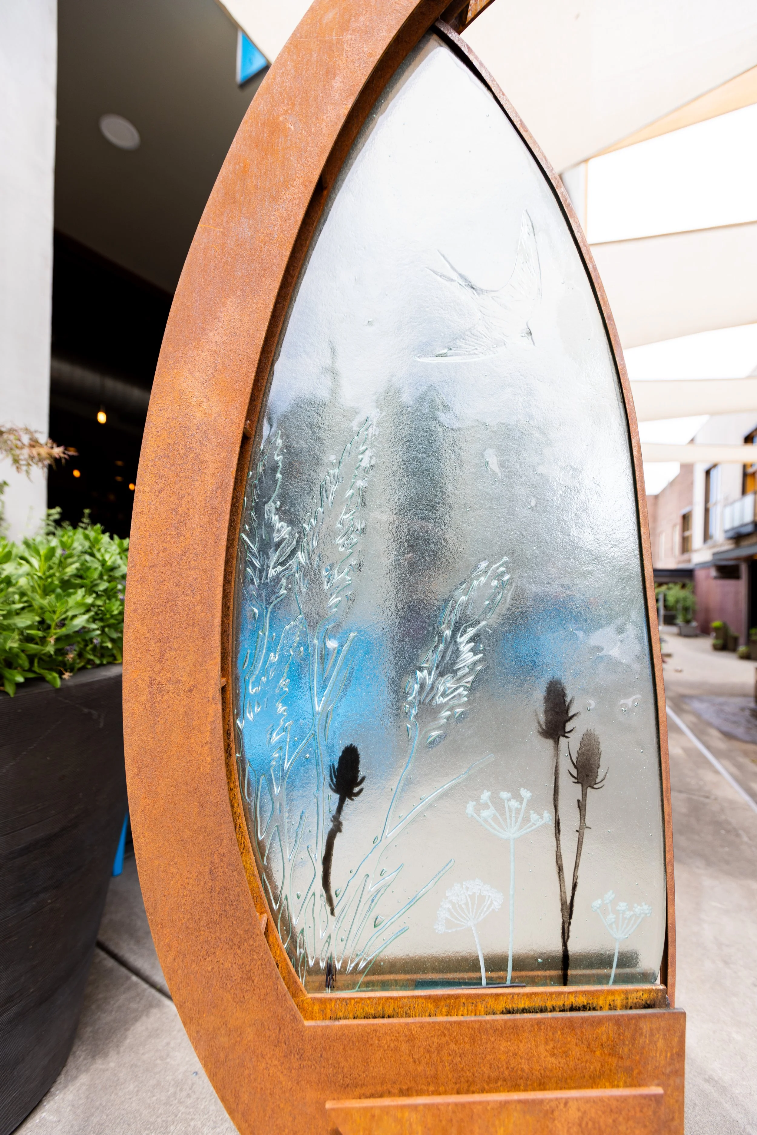 Seattle-born metal sculptor Milo White and San Francisco-native glass artist Lin McJunkin formed a collaborative team 8 years ago to create work that integrates their aesthetic and technical strengths. The intricate cut-outs in Milo’s layered metal structures, filled with Lin’s colorful cast glass, invite interplay with natural and artificial light. The effect of human behavior on our environment is often a focus of their work.